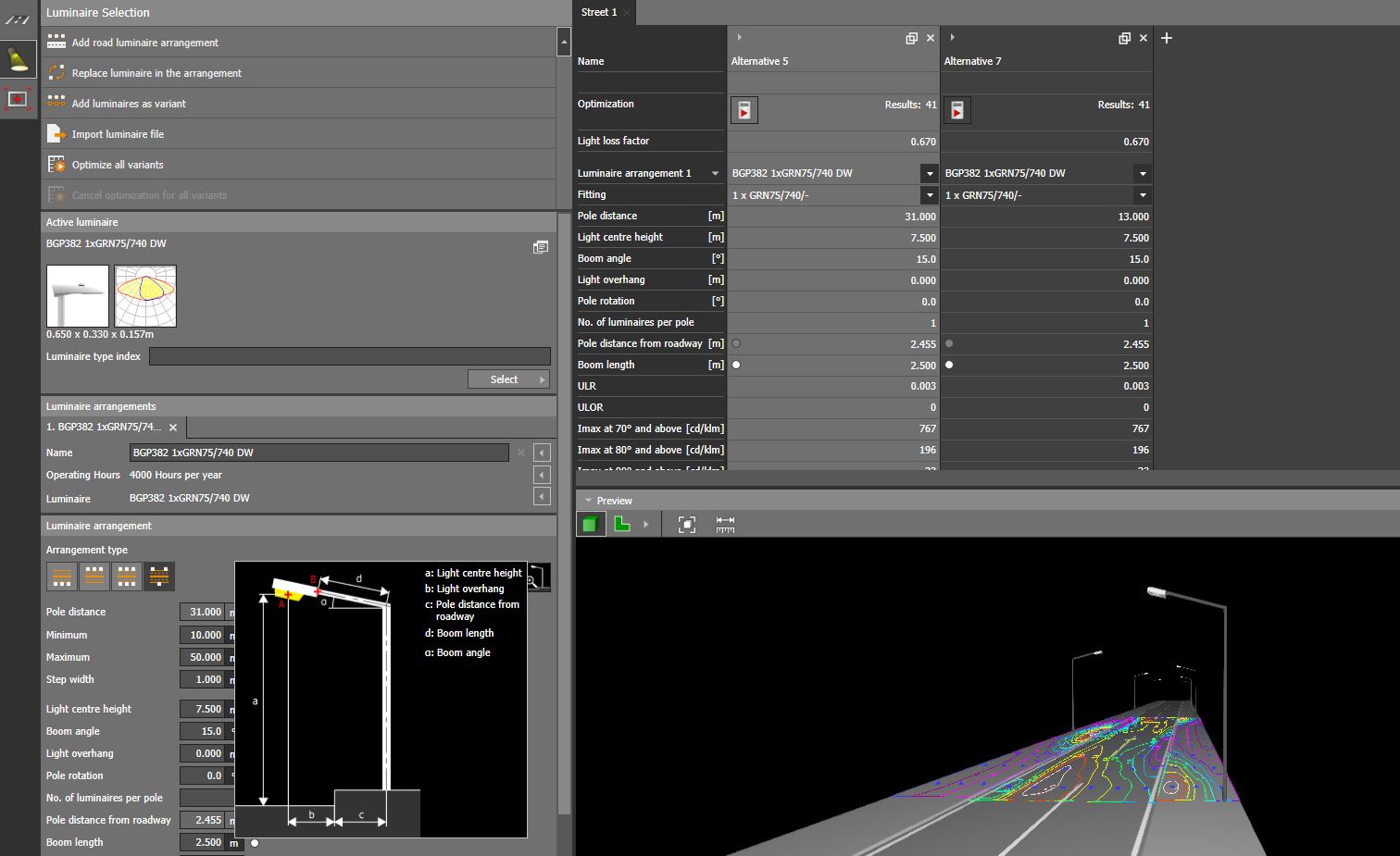 تصميم الإضاءة: حسابات مستوى الإضاءة لجميع الطرق والمساحات بالإضافة إلى المواصفات الفنية للإضاءة المستخدمة