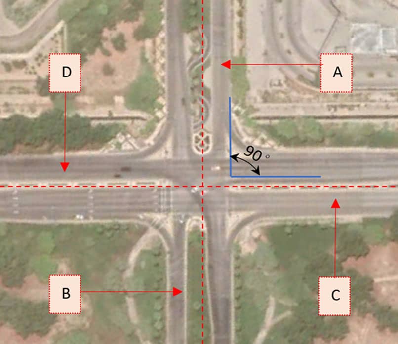 درجة محاذاة التقاطع تكون ° 90قدر المستطاع ولا تقل عن 60° إذا تعذر ذلك، هذا النطاق تم تحديده من قبل (AASHTO) شكل 1-2