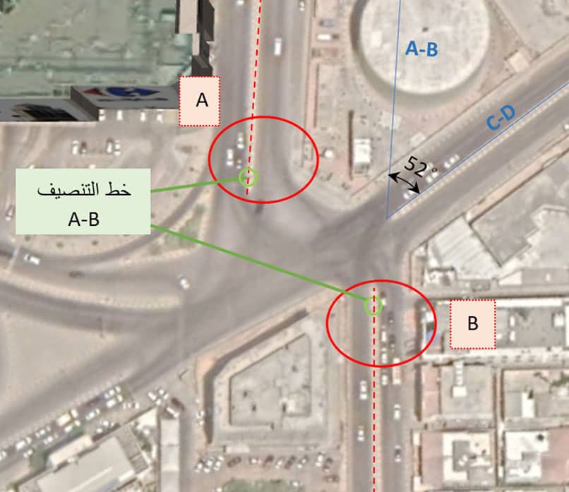 في شكل 1-6 تظهر في هذا التقاطع تظهر مشكلتين متداخلتين الأولى: درجة محاذاة التقاطع تقل عن الحد الأدنى 60° والثانية: الشارعين المتقابلين ليسا على خط تنصيف مشترك. حيث أن الزاوية بين الطريق المتقابل (A-B) والطريق المتقابل (C-D) = 52°، وأيضًا يتضح أن شارع -A- زيد بن الخطاب وشارع -B- اليرموك متقابلين مما يستوجب ان يكون خط التصنيف لهم مشترك و يعبر عبرهم بخط مستقيم إلا أنه يظهر أنهما لا يشتركان في نفس خط التنصيف بمعنى لا يعبر خلالهما بشكل مستقيم مما يجعله تقاطع غير منتظم.