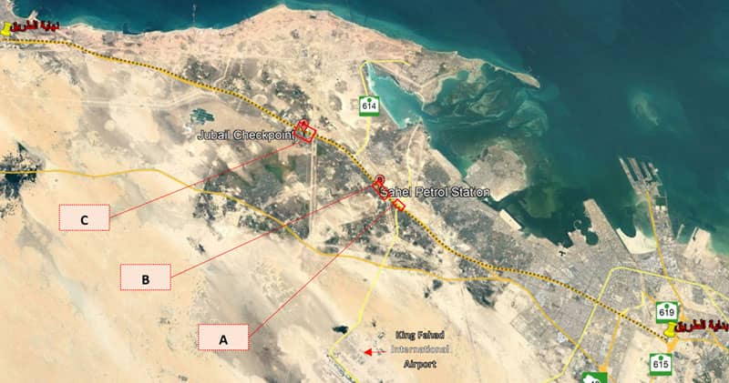 - غياب علامات التمهيد في مسارات الطريق قبل الاقتراب من نقطة التفتيش بأقل من 1000 متر (مسار الجبيل).