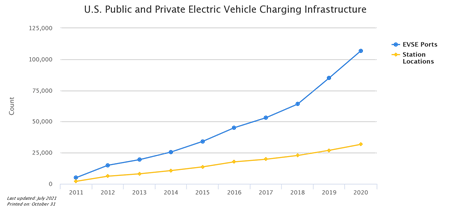 حيث يرمز المنحنى الأزرق إلى منافذ الشحن و الأصفر إلى محطات الشحن، المصدر U.S Department of Energy – AFDC