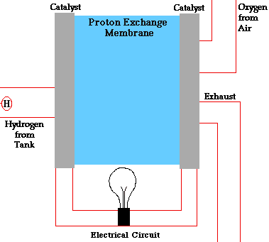 تتكون خلية الوقود من قطبين أحدهما موجب (أنود) و الآخر سالب (كاثود) و يتوسطهم كهرل (Electrolyte)، حيث أن الكهرل عبارة عن مادة ناقلة للكهرباء مصنوعة من غشاء البوليمرات PEM Polymer Electrolyte Membrane، و طريقة عمل خلية الوقود كالتالي: