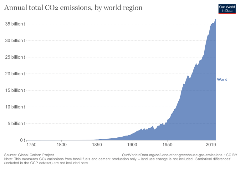 يتزايد ضرر هذه الانبعاثات على البيئة بمرور الوقت، حيث وصلت لما يقارب من 35 مليار طن بحلول عام 2019، شكل (2) .
