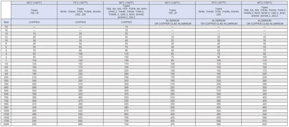 بعد أن عرفنا تأثير التيار و المقاومة النوعية لأبرز المواد الموصلة ، سنتعرض الآن احد الجداول المهمة التي تساعد في اختيار الحجم المناسب للسلك الكهربائي ، هذا الجدول تم صياغته بعد تتبع المعادلات الرياضية للكهرباء و إجراء التجارب العملية في NEC وهو اختصار لـ National Electrical Code وهو معيار عالمي تم تطويره من قبل الجمعية الأمريكية للحماية من الحرائق NFPA . علمًا انه يوجد العديد من المواصفات الأخرى و توصيات المُصنعين التي توضح اختيار الحجم المناسب و لكن سنشرح على هذا الجدول لسهولته :